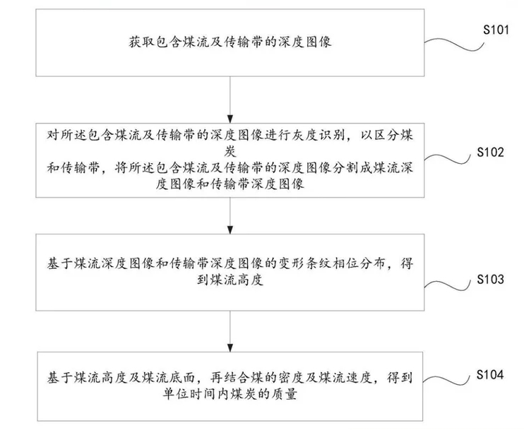 本發(fā)明通過處理包含煤流及傳輸帶的深度圖像,區(qū)分煤炭和傳輸帶及求取煤流高度,最后根據(jù)煤流高度、煤流底面、煤的密度及煤流速度,能夠準(zhǔn)確得到單位時(shí)間內(nèi)煤炭的質(zhì)量,這樣煤炭測量準(zhǔn)確不會(huì)受到煤炭運(yùn)輸時(shí)間的影響,保障了煤炭測量的精度;而且當(dāng)煤炭視頻圖像稱重系統(tǒng)中任一裝置出現(xiàn)故障時(shí),能夠及時(shí)進(jìn)行更換,設(shè)備配置簡單、安裝方便,安裝與拆卸均不影響運(yùn)輸系統(tǒng)正常工作。